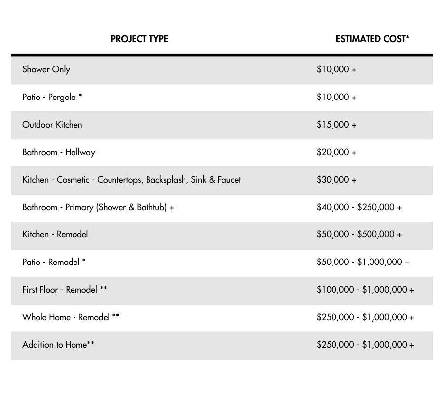 We are a general contracting company with design capabilities, so our project estimates include the design, materials, a dedicated project manager, permits and labor. However, Project estimates exclude costs for appliances, furniture or décor. As each project is unique; cost varies on size, age of home, level of finish and complexity.